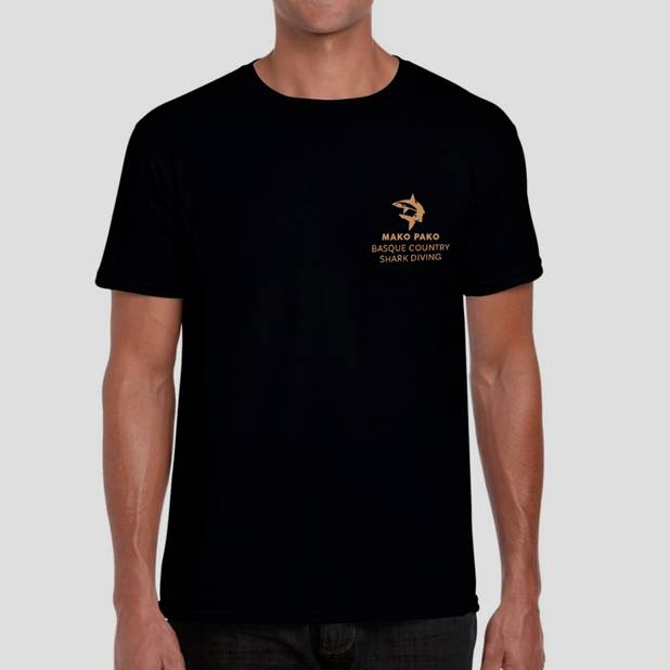 2025 Season Model. Black t-shirt with logo on the chest and a realistic color illustration of a blue shark and mako shark on the back. Limited edition of 25 units. Available in sizes S, M, L, and XL. Price: €20.